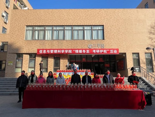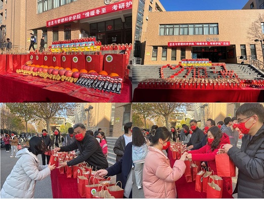 于龙子湖校区学生宿舍兰亭园前举办“情暖冬至,考研护航”考研慰问活动。院党委书记马新明,院长陈振,院党委副书记张利军,副院长户小英、李晔、乔红波出席活动,院团委全体老师及2018级考研学生代表参加活动。本次活动由院团委书记张玥主持。
