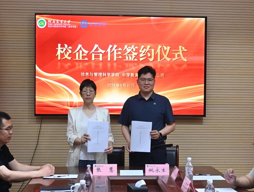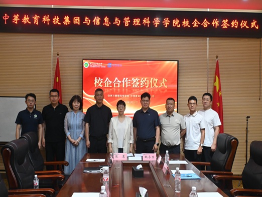 与中芽教育科技集团在繁塔楼A405会议室共同签订校企合作框架协议。院党委书记苏楠、副院长李晔、计科系主任张慧、计科系教工党支部书记刘合兵、团委副书记郭潇,中芽教育科技集团总经理姚永生、IT事业部副总杨国玉、品牌合作部主管王曦出席签约仪式。
